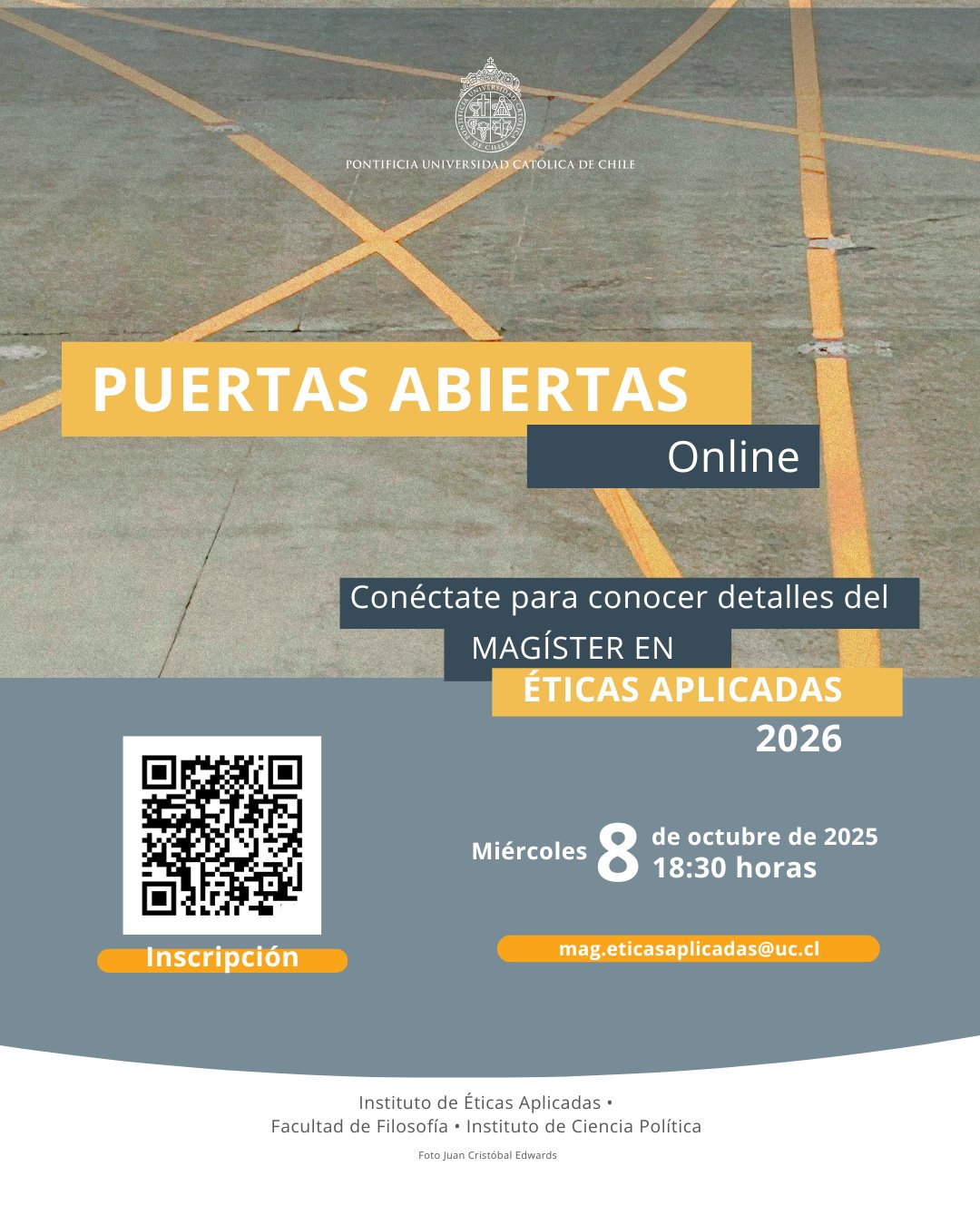 Te invitamos el miércoles 8 de octubre, a las 18:30 horas, a participar de una actividad de puertas abiertas online del Magíster en Éticas Aplicadas UC para que puedas conocer el programa de #ÉticasAplicadasUC,