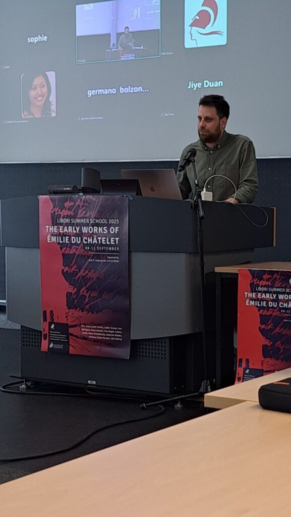 La presentación de Pricladnitzky,”Grammar as an Object of Scientific Inquiry”, abordó la Grammaire Raisonnée, un manuscrito de Émilie Du Châtelet que hasta ahora ha recibido poca atención dentro de su obra. Los capítulos conservados muestran que Du Châtelet concibe la gramática no como un sistema meramente convencional, sino como un objeto de investigación científica. Su enfoque fundamenta la gramática de los sustantivos en una generalización derivada de la metafísica de la sustancia y de su teoría de la hipótesis, vinculando así las estructuras lingüísticas con principios filosóficos. La presentación destacó las implicaciones de estas reflexiones gramaticales para comprender los fundamentos lógico-ontológicos del lenguaje en su pensamiento.